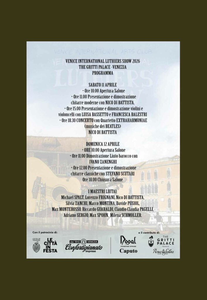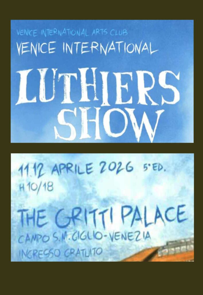 We are proud to have been selected for the small and exclusive VENICE INTERNATIONAL LUTHIERS SHOW, which will take place on the weekend of April 11th and 12th, 2026 in the ballroom of the Venice Premium Hotel – the GRITTI PALACE.